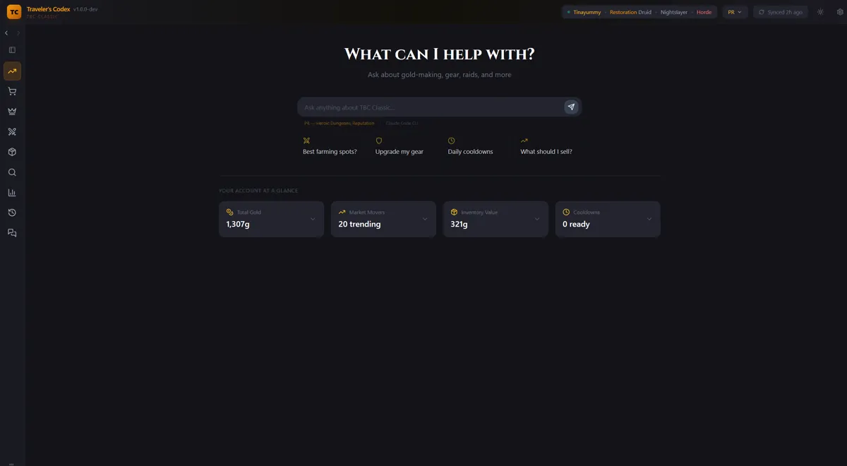 The desktop app automatically reads WoW's SavedVariables file and syncs everything. Your gold, gear, AH prices, and cooldowns are all there — ready for AI-powered insights.
